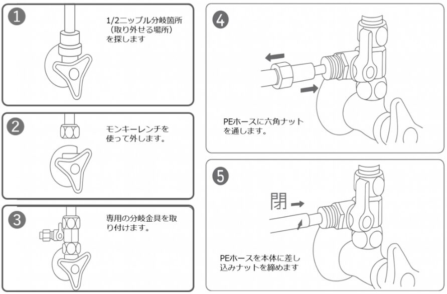その水を供給するために水道とPEホースでつなぐひと手間が必要です。水は蛇口からではなく、水道管から分岐します。とても簡単ですので、ここでは水道分岐の方法についてご案内していきます。