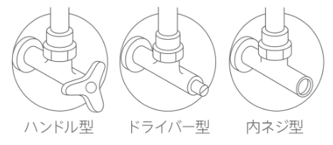 ●ハンドルタイプ: 蛇口のような形状のハンドルを、時計回りに回して「止まる」まで閉めます。