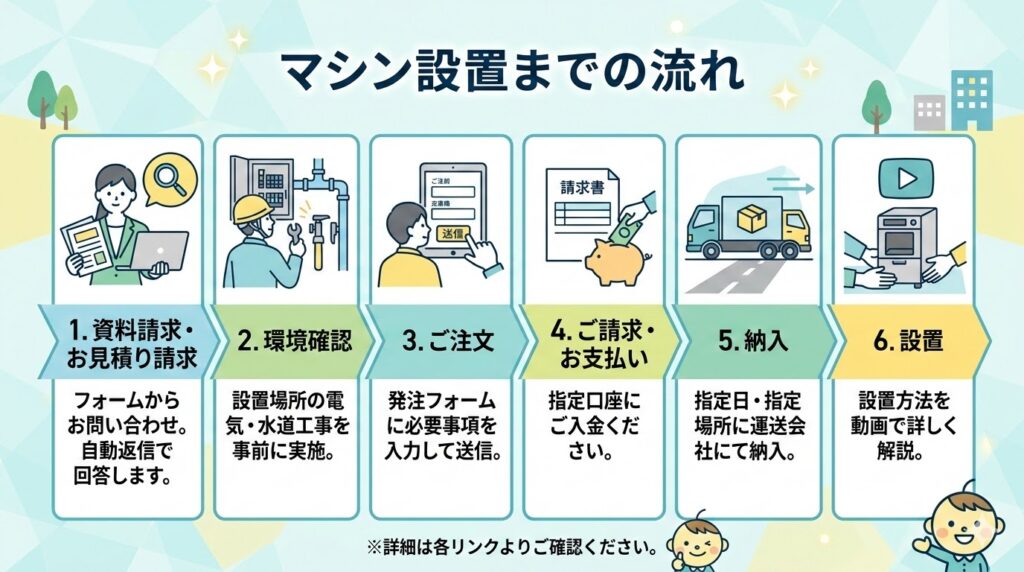 マシン設置の前にしっかり確認をしておくと安心です。ここではお見積り~事前の環境確認~ご注文から納品までの流れについてご案内いたします。